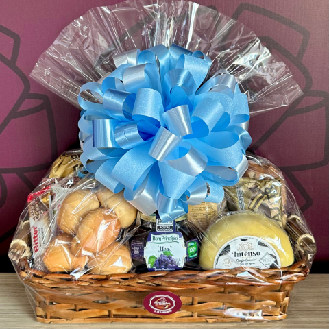O presente seguirá embalado com celofane e decorado com laço.