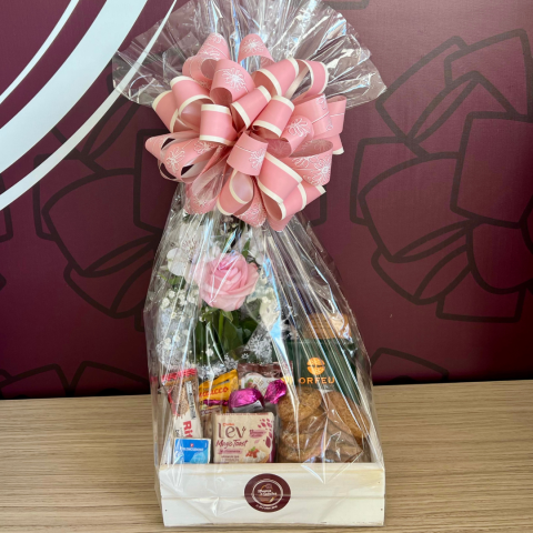 O presente seguirá embalado com celofane e decorado com laço.
